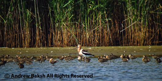| American Avocet (center) with Short-billed Dowitchers. |